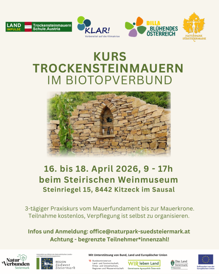Dieses Projekt wird im Rahmen des Programms KLAR! des Klima- & Energiefonds sowie des Projekts Naturverbunden Südsteiermark mit Unterstützung von Bund, Land und Europäischer Union umgesetzt.